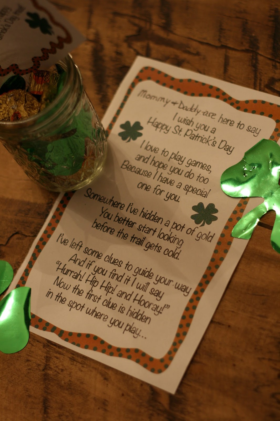 Evangeline looks forward to every holiday. I always try to make them extra special for her. She woke up to a scavenger hunt that lead her to a pot of gold (peanut butter cups in a mason jar). The clues were all over the house. She was upstairs and downstairs several times, in the refrigerator, dishwasher, etc. It was fun.